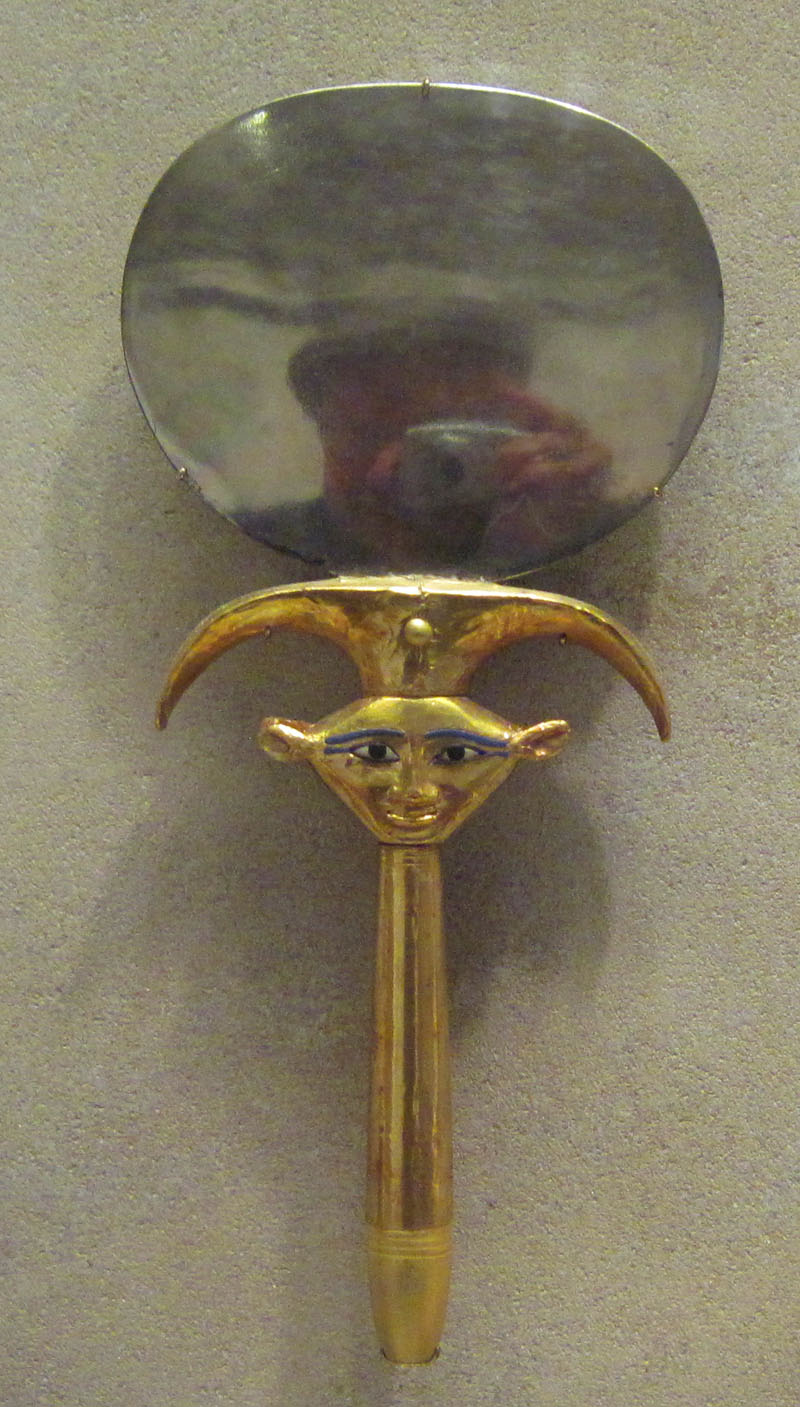 It was nonetheless practical: in the 12th Dynasty tomb of chief steward Meketra, for instance, a woman carries a basket full of beef, bread and vegetables so that Meketra will be assured of a balanced diet in the Afterlife. [Figure 5] Another grave item from the 12th Dynasty — the turquoise collar of storehouse manager Uah — may dazzle the casual visitor to the Metropolitan Museum who passes by, unaware of its subtle but significant testimony to faith: Hathor, the daughter of Ra, wife of Horus (her name literally means “the mansion of Horus”), divine mother of kings, and the “Lady of the West” who waited each evening to receive the setting sun, was also revered as the “Lady of Turquoise.” [Figure 6] Hand mirrors typically had umbrels formed in the image of Hathor, who was also the goddess of beauty and feminine grace, and they reflected, if you will, a meaning that would be explicit to the Egyptians but opaque to others unless they knew that the word for mirror was also the word for life, ankh; look in the mirror and you see the living image of yourself, beautified by the divine intercession of Hathor. [Figure 7] Theology was everywhere, in everything.