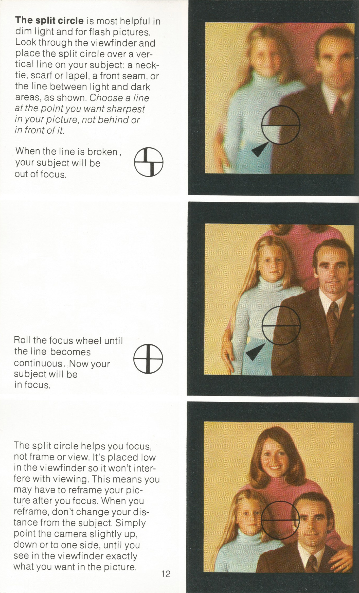The earliest version of the Polaroid SX-70 did not have a split-circle focusing screen, and people found it difficult to use. Dr Edwin Land did not like the idea of having a split-circle in the viewfinder, arguing that it would interfere with viewing. However, the managers in the company pushed for a split-circle because many customers were complaining. They found a middle ground and placed the split-circle in the lower half of the screen. Notice that the split-circle is not in the center like most cameras.