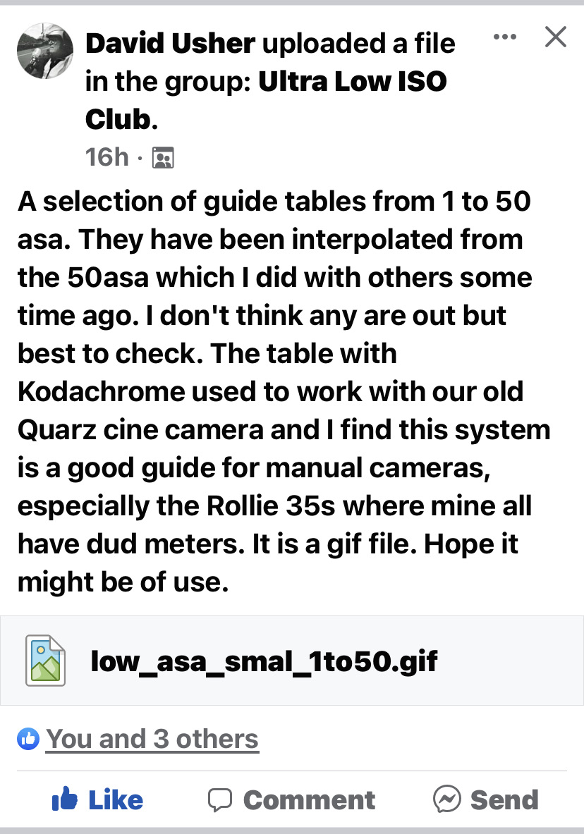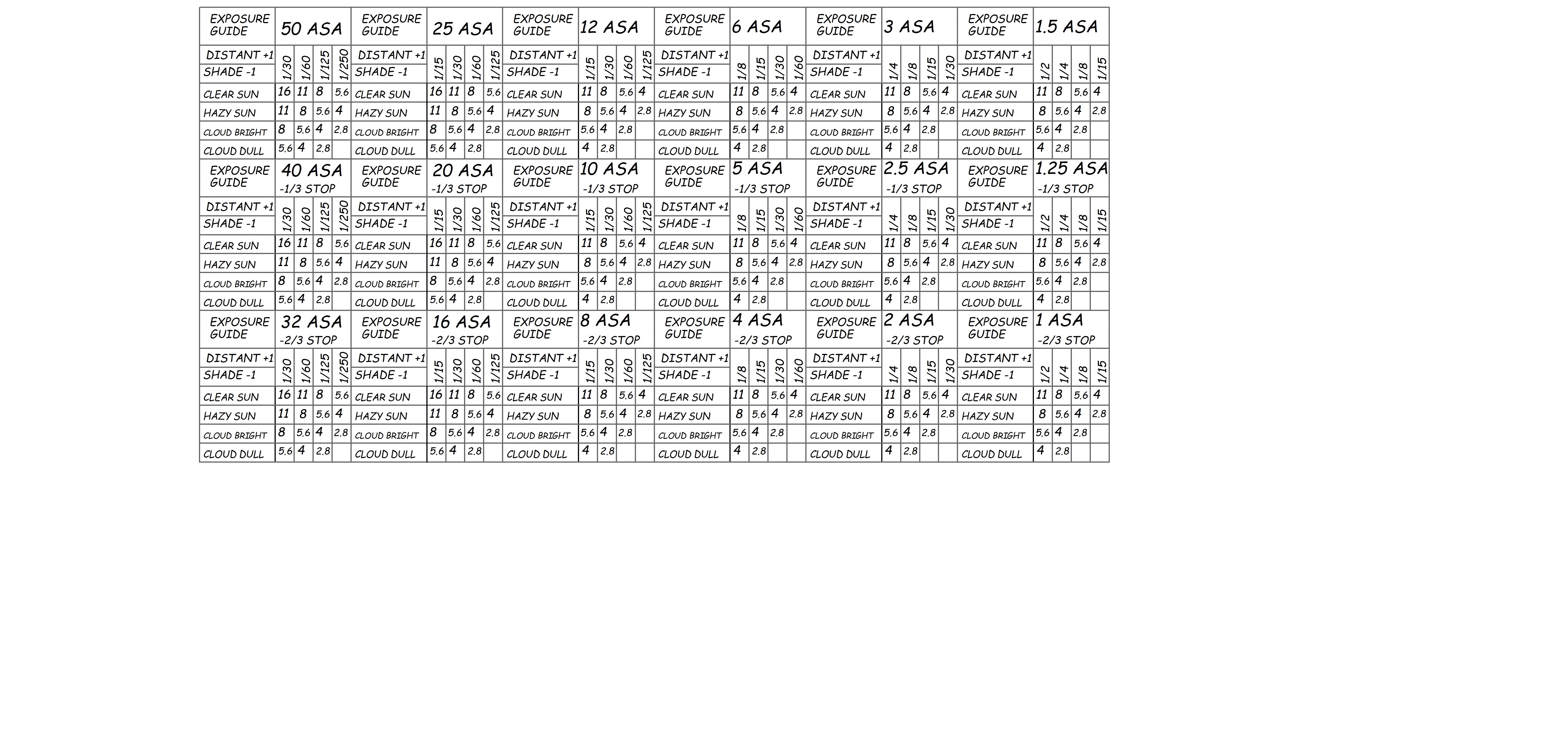 A selection of guide tables from 1 to 50 asa. They have been interpolated from the 50asa which I did with others some time ago. I don't think any are out but best to check. The table with Kodachrome used to work with our old Quarz cine camera and I find this system is a good guide for manual cameras, especially the Rollie 35s where mine all have dud meters. It is a gif file. Hope it might be of use.