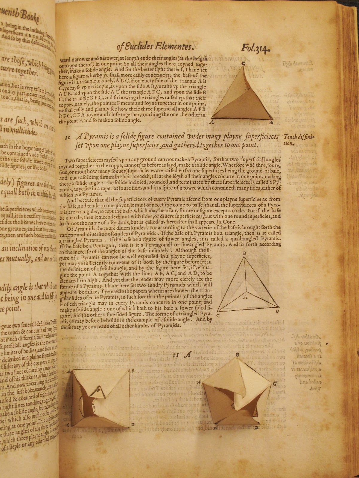 Simultaneously with these studies, I am conducting a survey of a few hundred editions of Euclid, beginning with Erhardt Ratdolt's edition of 1482 and ending with editions from the last few years. For those of you who are unfamiliar with the structure of the Elements, there are thirteen books comprising roughly twenty to fifty propositions. Each of the propositions begins with an enunciation of what is meant to be proven, followed by the proof and conclusion which are illustrated by a line diagram. These diagrams have remained constant for hundreds of years and so it is interesting to see how designers and printers have tried to distinguish their edition from others—you can tell instantly if the printer had fun with geometry or took it a little too seriously. Below I've attached just two examples. The first is from Paganius Paganinus' 1509 edition edited by Fra Luca Pacioli and it is pretty much exactly what one would expect from a Humanistic friar: tall slender columns of uninterupted text with the squares, trapezia, etc. tucked safely in the margins. The second is published by John Daye in London in 1590, showing his lovely little pull-up illustrations from Book XI. Daye's is closer to the spirit which I will try to evoke in my edition.