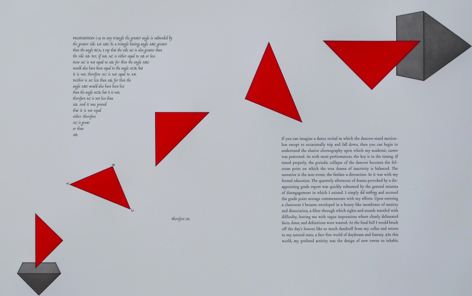 My method for working on Thirteen Propositions is similar to my method in the tenth grade. I am beginning by reading and drawing proofs for all the propositions in Euclid's thirteen books. Along the way, certain propositions stand out as having a particular interest or relevance: they spark associations in literature, letter forms, or life (or all three). I then begin to develop visual ideas, write bits of text, and begin reading other books that might inspire or relate to the proposition at hand. My thought at this point is that each proposition will involve a work of Greek literature but it is too early to tell if that will be the case. While some of the reading is great fun, the Iliad, David Copperfield, Edith Hamilton, Euclid, etc., some is less thrilling. Just a few days ago I received a copy of a ninth grade algebra text book that sent strange shivers through my body, an uncomfortable electrical current connecting me with my awkward thirteen year old self. Thankfully, I am able to read through a chapter a day, meaning that it will be a quick torture. There are only fourteen chapters.