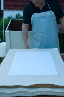 I have never, since my first dabbling at Dieu Donné, seriously entertained making my own paper. I already have enough to concentrate on doing and, in thinking about the aforementioned damp New York City loft, it has been hard for me to see the attraction of dipping in and out of a cold vat of water all day. For the first time in Oxford I understood why people would go through the trouble. As you rock the mould from side to side and front to back, there is a moment when, all of a sudden, you see the sheet form. The dissolute fibers interlock and, in the suspended water trapped in the deckle, the porous congregate of fiber becomes a contiguous whole. It is a small epiphany that tells you when to stop moving and it is charged with the same creative excitement I experience pulling a good print. It was almost inspiring enough to make me set up a paper studio....