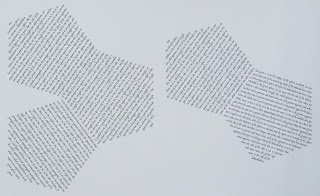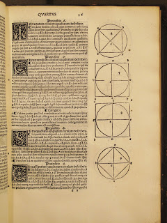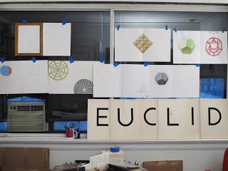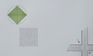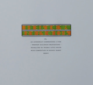 In the frantic run-up to the CODEX Book Fair and Symposium, I have been proofing some early spreads from my upcoming Euclid book. In the process I have been tossing around some possible title ideas. Serious contenders thus far have been "Therefore Etc.," "Extreme and Mean," "Syllogisms," and "Euclid Avenue." For the time being I have settled on: Interstices & Intersections or, An Autodidact Comprehends a Cube. Below are samples of what I have done so far, representing Propositions i.19; iii.1; iv.6; and xiii.17. (The large blank spaces are where as-yet-unwritten text will go.) Keep in mind that these are early proofs from a project that has another year, at least, yet in the making, so anything is open to change during that time. Tomorrow I will bring the sheets up to Daniel Kelm in Easthampton, Massachusetts so that he can bind a mock-up for the fair.