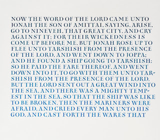 I am currently working on a small edition of The Book of Jonah, hand-set in my typeface Nicolas and printed on a special making of Twinrocker Handmade Paper. The story of Jonah is one to which I have returned repeatedly, though I had no specific plans to print it until I acquired a large font of Nicolas from the Dale Guild Type Foundry last year. Inspired by the twelfth century enamel lettering of Nicolas of Verdun, the letterforms in Nicolas are designed to embody a physical content as well as convey a literary one—they are spiky, voluptuous letters that would be ill-suited for most commercial book work. Cast at a large size of 24pt, the typeface would typically be considered a titling face but my intention when designing it was that it would be used for continuous text. After living with the font for a few months I began experimenting with various settings and page proportions. It quickly became apparent that Jonah was the right text for the alphabet.