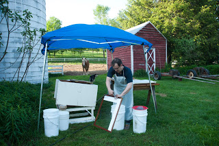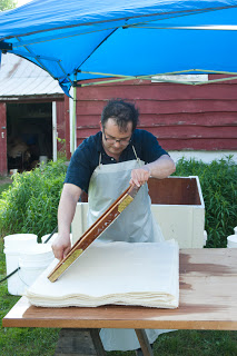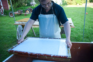room to pull and couch the sheets en plein air. The last time I pulled a sheet of paper was in 1994 in the Dieu Donné studio on Crosby Street, a cramped, damp place lodged between sweat shops on the edge of Chinatown. By contrast, the set up in Oxford was an Arcadian dream, made only slightly less idyllic by the constant chores upon which the farm depends (chores that Annie gladly assisted in and to which I, by contrast, applied my lifelong maxim: stay out of a worker's way).