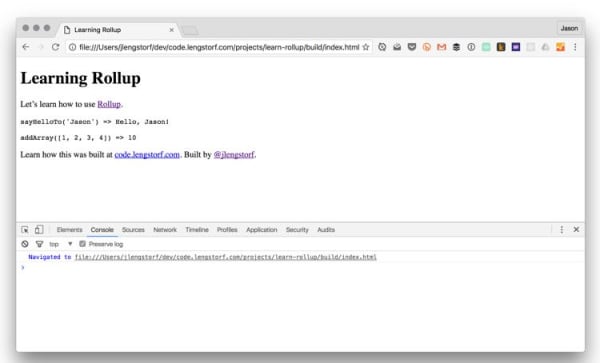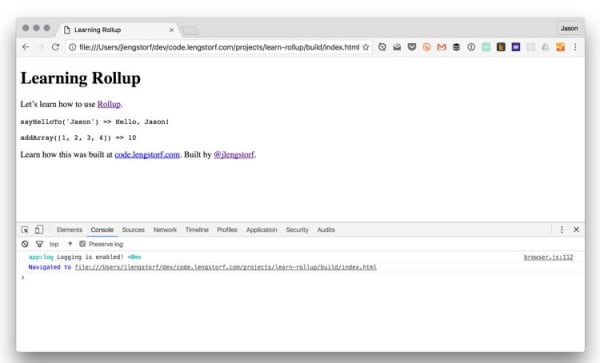 Rebuild the bundle with ./node_modules/.bin/rollup -c, then check the browser again to see the output: