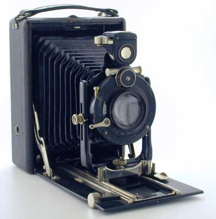 Interesting about this camera is the shutter. Every leaf shutter has to open and close a set of blades so they have a mecanism to do it with different speeds according to the pressure on a spring. But for very low speeds (below 1/50 more or less) it is not possible to make the spring looser and looser because it has to move after all. The solution is to add another mecanism to slow down the spring. To give it more work. There are basically two types of mechanical devices for that: one is the common clockwork and the other is the one that fits this Maximar: the pneumatic. When the spring is forcing the blades to close a "hammer" acts upon a cylinder where air has to pass through a small hole. That takes time. Just the time needed to allow more light reaching the film ! Up to one second in this case. I think it is clever. On top of that, this one you don't have to cock. Just act the shutter lever and it is always ready. You can see the cylinder is on top of the disk on top or the lens. Lens is Doppel Anastigmat Litonar f1:4.5 13,5 cm. Format is 9x12 cm and of course it has a ground glass focusing needed to use the rising and cross front movements.(to see what is the effect of rising the lens go to F.Deckel page) This camera is solid and well constructed. There were hundreds of models that from the distance look like that. One must have it in hands to fell the quality of materials and design.